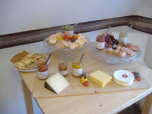 - Zwiebel-Johannisbeere (Rote Zwiebeln, schwarze Johannis-beere, Gelierzucker (Zucker, Geliermittel Pektin, Säuerungsmittel Citronensäure, Konservierungsmittel Kaliumsorbat, Sonnenblumenöl), Wein, Essig (6% Säure), Tomaten, Rapsöl, Chili, Ingwer, Gewürze, Pfeffer, Salz).